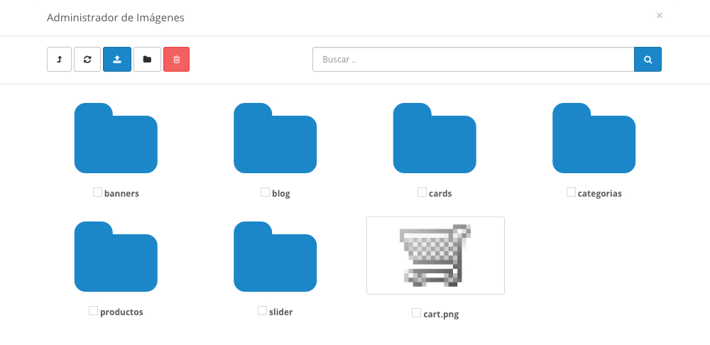 El objetivo de esta sección es familiarizarse con el Administrador de imágenes. El Administrador de Imágenes es una herramienta que se utiliza en la administración de la tienda para subir archivos de imágenes (archivos jpg o png). Esta función se utiliza en las secciones: Categoría, Producto, Banner, Configuración de tienda, etc.