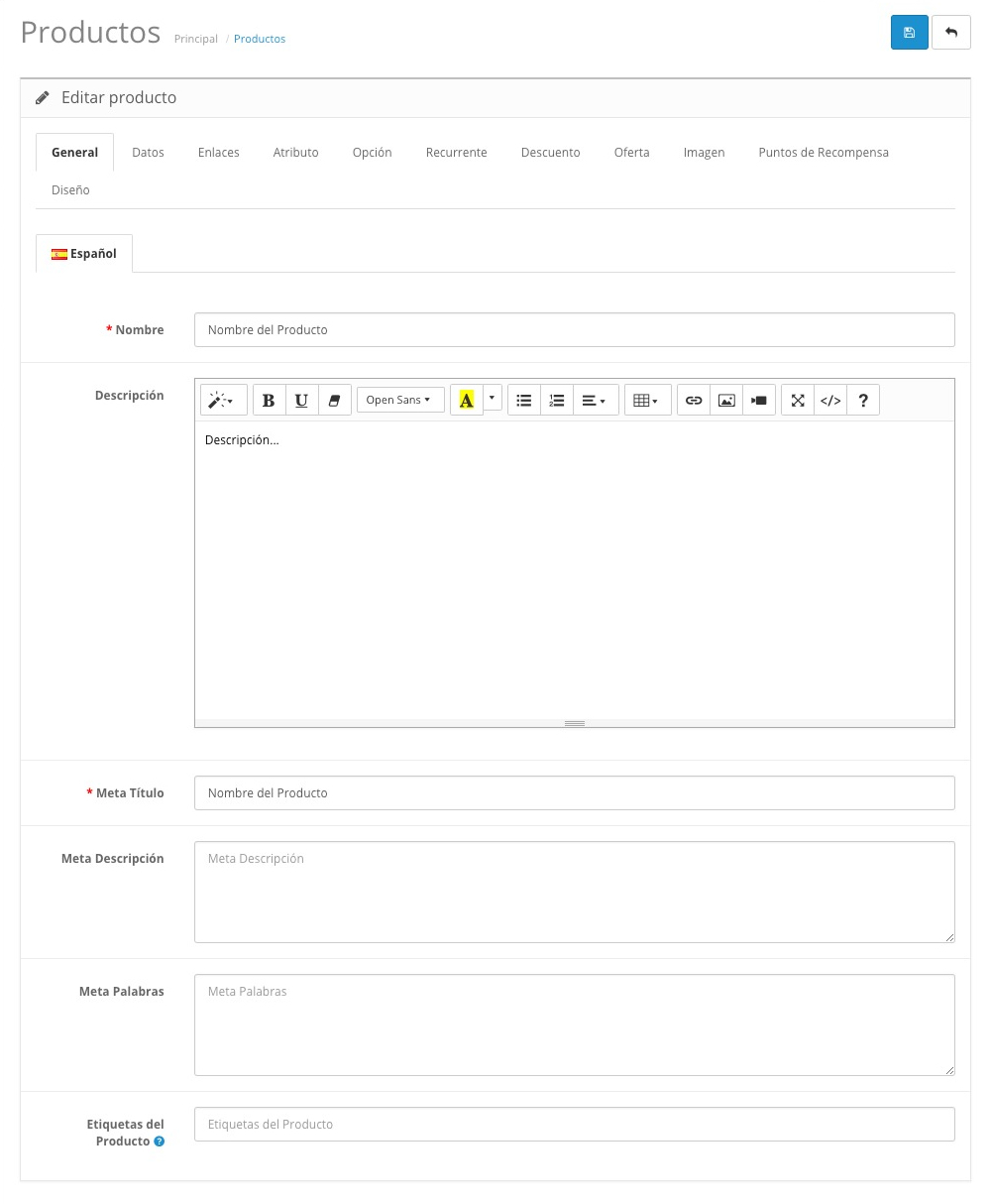 Vea también las secciones: Pestaña General, Pestaña Datos, Pestaña Enlaces y Pestaña Imágen, para conocer qué información colocar en cada pestaña de la ventana Editar Producto